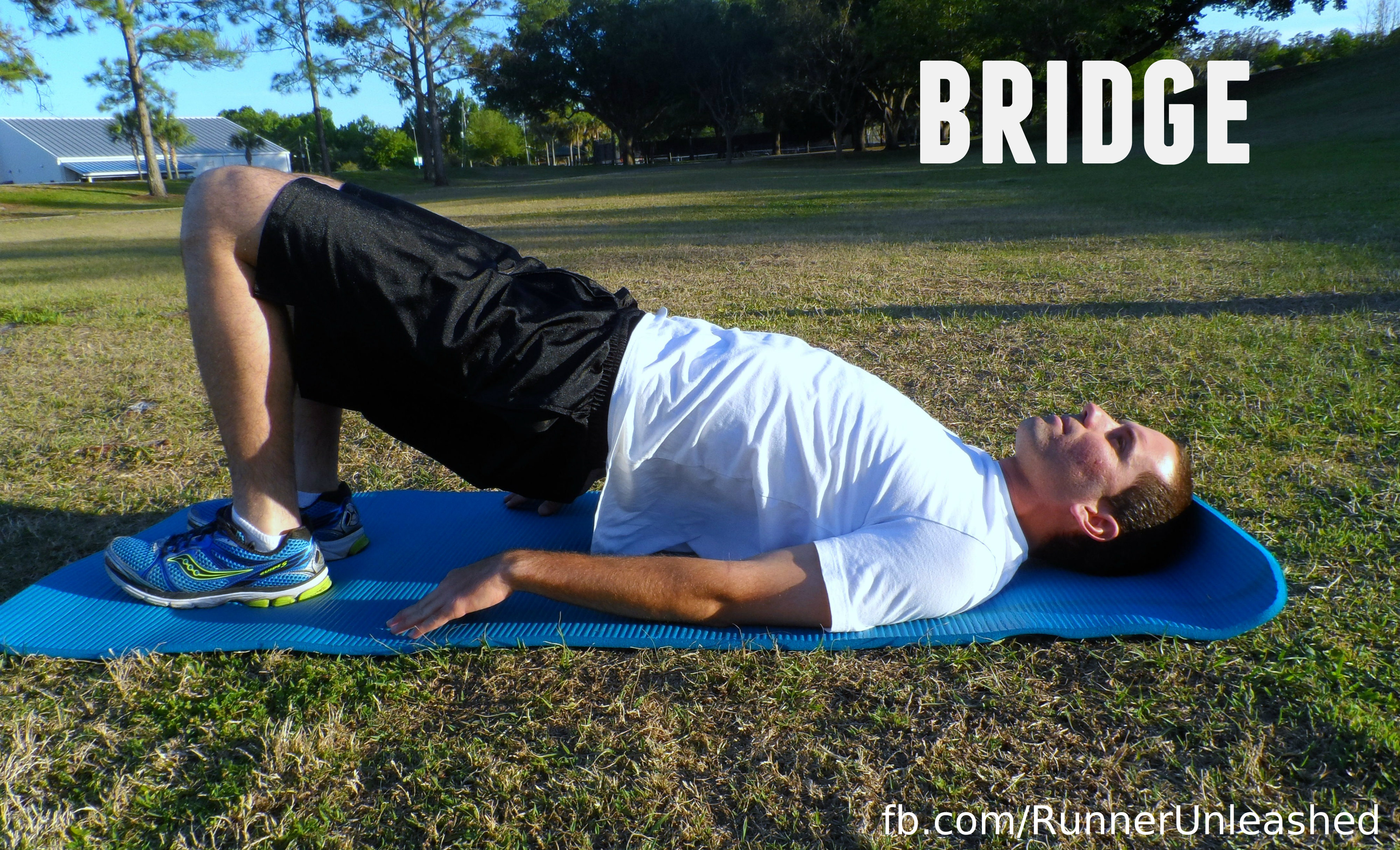 BRIDGEย ย Lie on your back with your hands by your sides. Keep your knees bent and feet flat on the floor with your feet under your knees. Tighten your abdominal and buttocks muscles, and raise your hips up to create a straight line from your knees to your shoulders. Squeeze your core, and try to pull your belly button back toward your spine. Maintain a straight line from your shoulders to your knees and hold for 20 to 30 seconds: