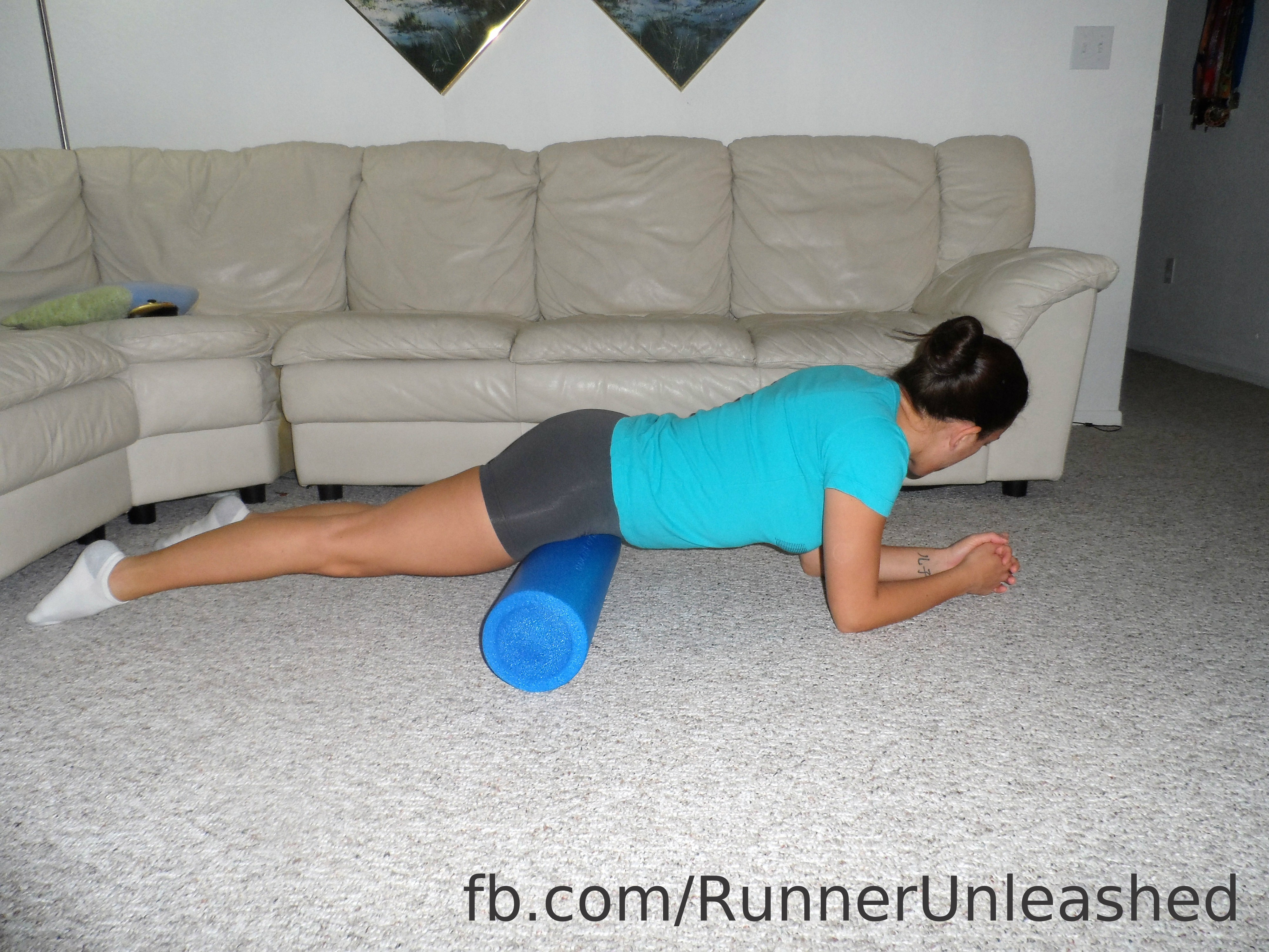 FOAM ROLLING!-ย ย Lie on your side and rest your hip on the foam roller. Holding your body weight on your elbow, roll your body up and down over the foam roller for about one minute on each side. As I said before, if you find your point of pain, stay in that area a little longer to release the tension. There is another foam rolling stretch you can do for the hip flexor, which is the one I’m more comfortable doing and seems to be more effective.