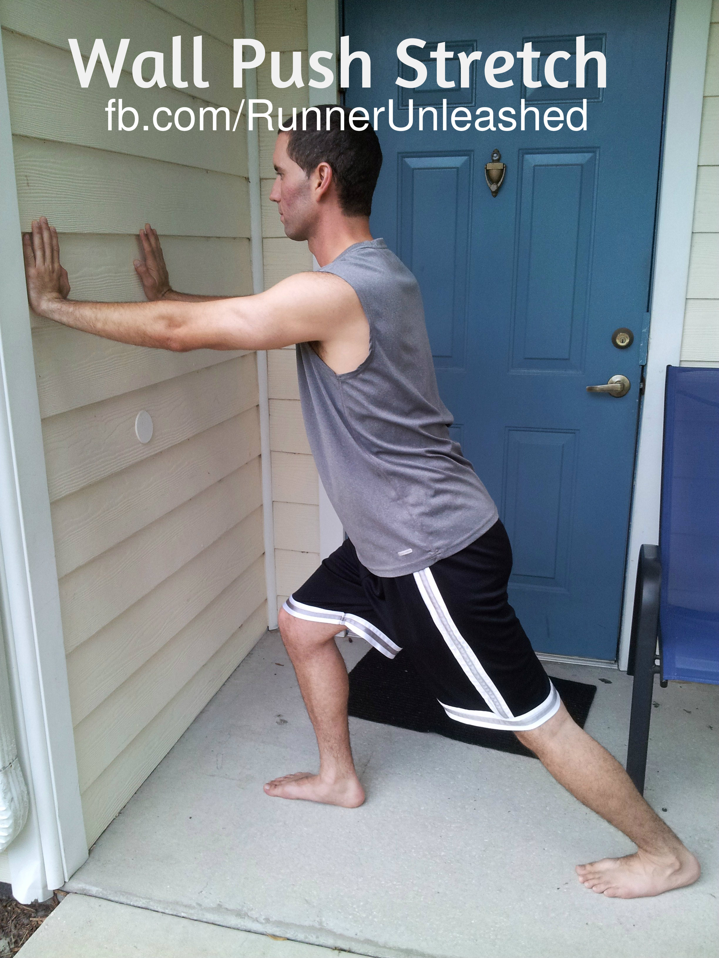 - doing a calf stretch is awesome as it strengthens your calf muscle, and reduces the stress on your Achilles tendon. There are a few calf stretches you can do such as: Put the calf you want to stretch behind you, being sure to keep your heel pressed to the floor and the leg extended without bending the knee. The other leg is in a lunged forward position in between the wall and the extended leg. Keeping your heel down, slowly bend your elbows and lean forward.