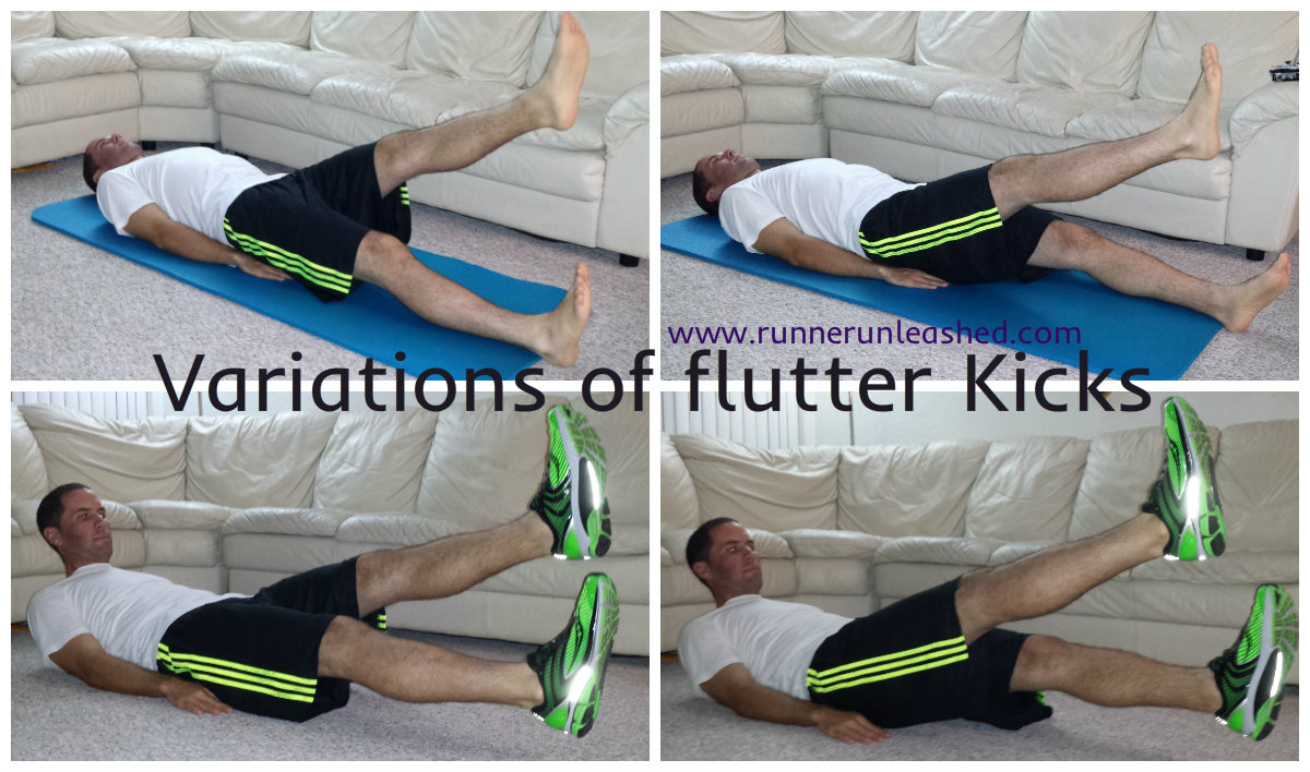 To perform flutter kicks, you should start by laying with your back flat on a mat with your legs fully extended. Thenย place your hands under your butt or close to.ย Lift your legs off of the ground about 6 to 8 inches and continue to keep your legs fully extended.ย Once in this position, (1)raise your left leg higher than your right, keeping the knee straight. (2)Then bring that left leg down and having your right leg up, (3)bring your left leg up and all that counts as 1 set(2 count). KEEP YOUR ABS TIGHT!!!!! It protects your lower back
