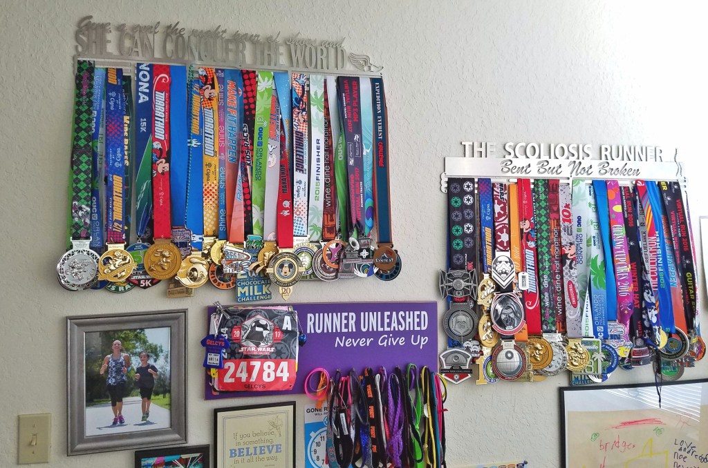 Life is waaay to short to spend it wishing and dwelling on things that make you unhappy. So I run and enjoy the thing that make me happy while I can. While my body is falling apart, my heart, mind and soul aren’t! Running is my thing. Running is my love and my joy of life. Being able to look at my wall of accomplishments and see all the medals I have earned and go back and think what I went through to earn them, makes it all worth it.